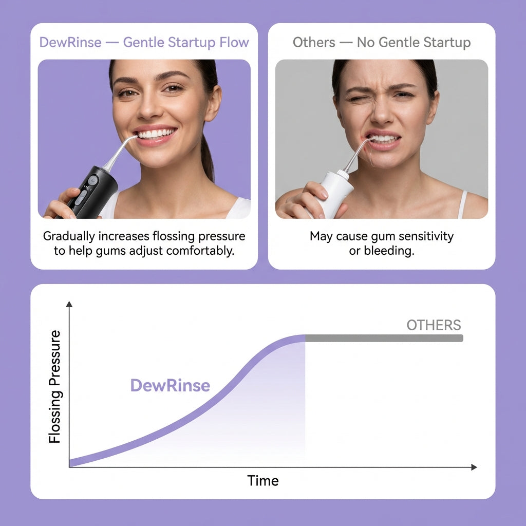 Pressure gradually increases from startup so sensitive gums adjust comfortably. No shock, no bleeding, no reason to avoid the routine.